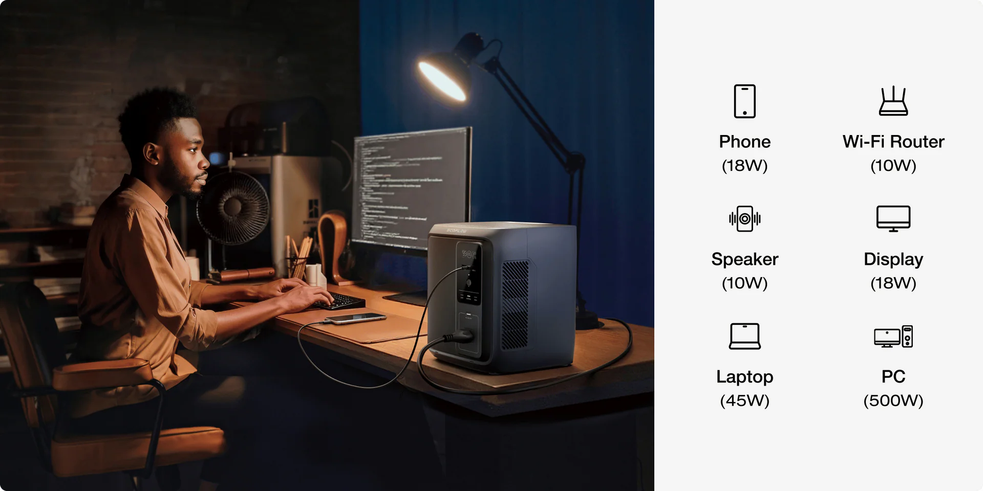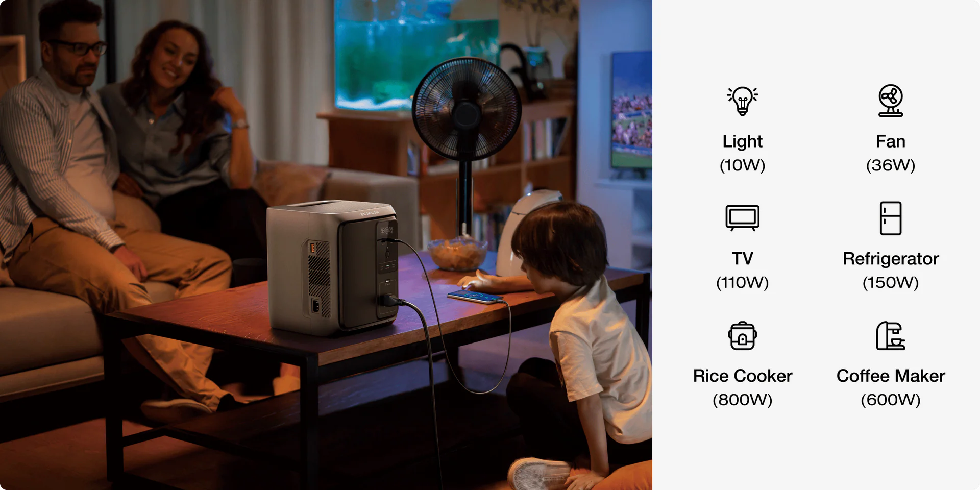 Gracias a su diseño de alta capacidad, el DELTA 3 1000 Air ofrece un respaldo duradero para los artículos esenciales del hogar. Desde mantener la luz encendida durante la noche, hasta hacer funcionar ventiladores y refrigeradores durante cortes de luz prolongados. El DELTA 3 1000 Air le brinda a la familia tranquilidad durante todo el día sin interrupciones.