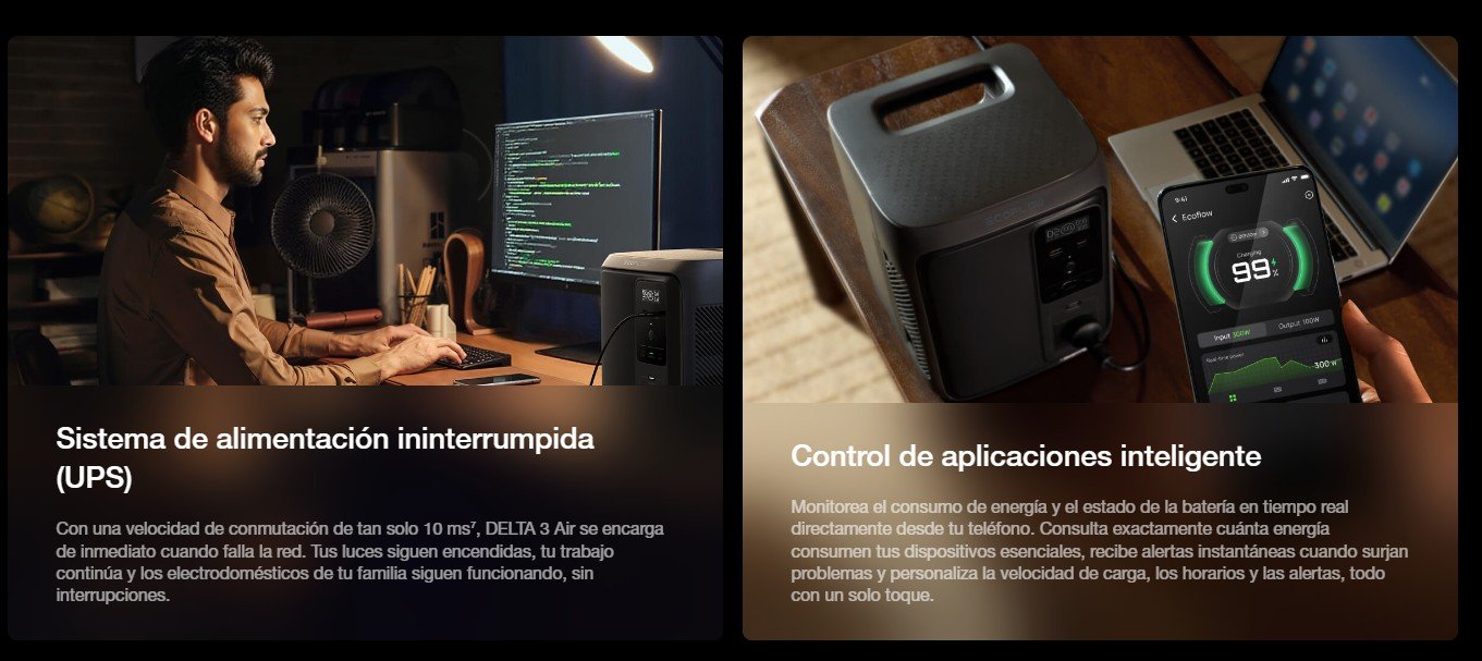 Cuando se detecta inestabilidad, DELTA 3 1000 Air cambia automáticamente a su propio suministro, garantizando energía ininterrumpida y segura para su hogar.